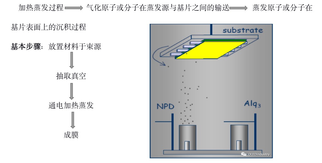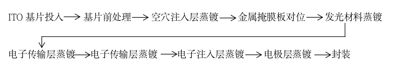 小分子OLED器件通常采用真空蒸镀法制备有机薄膜和金属电极,其具体操作过程是在真空中加热蒸发容器中待形成薄膜的原材料,使其原子或分子从表面气化逸出,形成蒸汽流,入射到固体衬底或基片的表面形成固态薄膜。