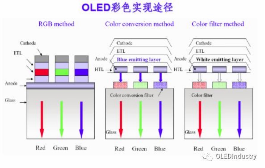 小分子OLED全彩色显示技术方面,实现彩色化的方法有光色转换法、彩色滤光薄膜法、独立发光材料法等。