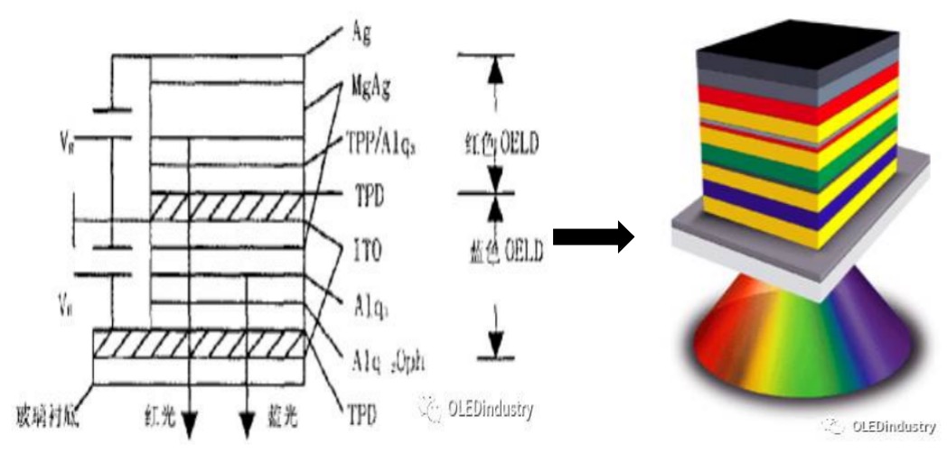 此法是将三种发光层叠在一起,使红、绿、蓝混色产生白光,或是互补色产生白光。此全彩化技术最大的优点是可以直接应用液晶显示器现有的彩色滤光片技术,但是元件发光时必须多经过一层彩色滤光片,导致亮度衰减,因此在透光率与成本上必须再深入研究。