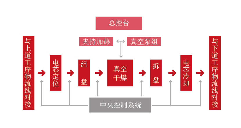 设备用于电芯等物料的物流调度及干燥功能,具备工艺流程自动控制,历史数据查询导出,关键参数实时显示,问题报警及原因追溯,安全保护,主要功能包括:电芯扫码、上料及缓存、物料烘烤、水含量测试、电芯冷却、温度检测及下料。